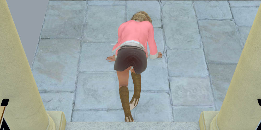 …she trips and falls to her knees.